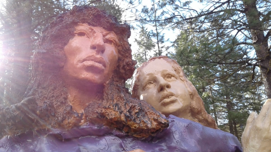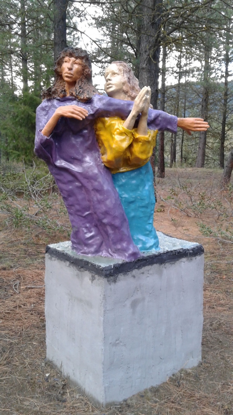Dedicado en la Grunewald Guild Plain, Washington, 29 de abril de 2017 Nadie puede saber con certeza qué ocurrió para inspirar la historia de la destrucción de Sodoma y Gomorra. Tampoco podemos saber realmente sobre el impacto que el cataclismo tuvo en las vidas de Lot y su familia. Sin embargo, los teólogos, creadores de opinión política y artistas han vuelto a narrar y reanalizar esta historia llegando a diversas conclusiones sobre lo que "realmente sucedió" y los mensajes que esta historia debe transmitirnos. En un momento clave de esta historia, el justo patriarca Lot (2 Pedro 2: 6-8) ofreció a sus hijas vírgenes a una multitud incensada de hombres en un intento de aplacarlos (Génesis 19: 8): "Os ruego, hermanos míos, que no actuéis de manera tan perversa. He aquí, tengo dos hijas que no han conocido a ningún hombre. Permíteme que los traiga a ti, y haz con ellos lo que quieras. Me motivó a reinterpretar ese momento porque durante los milenios prácticamente ninguna de las interpretaciones teológicas o representaciones artísticas de esta historia ha hecho un sincero esfuerzo por entender lo que pudo haber sucedido desde el punto de vista de las dos hijas sin nombre. En esta escultura intento retratar a estas dos chicas (probablemente más adolescentes protegidas e ingenuas que mujeres) como personas amenazadas traicionadas por la persona más poderosa de sus vidas. Un momento dramático y fugaz se reconstruye imaginándolos como personas multidimensionales con reacciones completamente humanas. Aquí las chicas no son meros aderezos en un juego todo masculino. Este trabajo afirma algo que todos sabemos - que la agencia femenina siempre ha existido - incluso cuando no se reconoce o se malinterpreta. Las chicas reaccionan de manera diferente. La hermana menor está asustada y confundida porque nunca ha cuestionado el amor de su padre y no puede comprender cómo él podría proponer que se haga algo tan reprobable a su niña. Ella podía ser la cuarta hija de Lot de la tradición talmúdica (Paltith o Plitith), un verdadero cariño que se compadecía de un hombre desamparado sin hogar y diariamente le daba a hurtadillas comida y bebida sólo para ser castigado por su generosidad por los inhóspitos Sodomitas que la quemaban viva o la colgaban al sol cubierto de miel para que las abejas (o hormigas) la comieran viva. Me pregunto cuánto su mirada - muy común en la iconografía religiosa como inocencia santo- es en realidad la incredulidad de que el mundo puede ser tan injusto. Por otra parte, la hermana mayor - a la que he llegado a creer es poseída por sí misma, inteligente, ferozmente independiente y confiada - se adelanta y mira a la frenética muchedumbre mientras extiende un brazo y una pierna protectores frente a su ingenua hermana. Yo imagino a la hija mayor como uno de esos seres humanos especiales y fuertes que la mayoría de nosotros sólo nos encontramos en raras ocasiones en nuestras vidas. La evidencia circunstancial apoya esta interpretación. Ella es una de las tres únicas mujeres registradas en la Biblia hebrea hablando con otra mujer. Más tarde, en una cueva con vista a las llanuras ardientes de Sodoma y Gomorra y convencida de que el mundo entero había sido destruido, se decide encargar de repoblar el mundo organizando que ella y su hermana tendrían relaciones incestuosas con su embriagado padre. Sus acciones decisivas para salvar a la humanidad de la extinción total dieron lugar al linaje que produjo a Ruth, David y Jesús. No son logros insignificantes para un adolescente cuyo nombre ni siquiera se registra. Tal vez era una persona tan destacada que los patriarcas de la iglesia tuvieron que neutralizarla a través de la calumnia teológica. Sólo busque en Google "Lot's Daughters" y usted encontrará docenas de representaciones artísticas de esta historia. Algunos muestran hijas obedientes acompañando a su padre de Sodoma con la madre en varios estados de deshidratación. Pero la mayoría de los artistas han optado por centrarse en la cueva y han creado descripciones explícitamente salaces y misóginas de las niñas, generalmente semi desnudas, como engañadoras lujuriosas, traidoras y seductoras. Hay muy pocas representaciones que se acercan a una interpretación moderna informada de esta historia como un caso clásico de encubrimiento en el que un padre alcohólico es un abusador sexual en serie de menores de edad quien culpa a sus víctimas por seducirlo. Encontré a sólo un artista contemporáneo que (poco convincentemente) retrató el momento de la vulnerabilidad de las niñas. Prácticamente todos los comentaristas bíblicos culpan a las adolescentes mientras dan a su padre maduro un pase completo (las chicas son "tan desvergonzadas como no tienen nombre" según una fuente, y John Calvin las atacó salvajamente). Hoy, sin embargo, pocos aceptaríamos que un patriarca poderoso y experimentado pueda ser absuelto de sus defectos mientras culpaba a sus hijas inmaduras y no experimentadas. En mi representación las muchachas pueden estar afuera sin preocuparse y pueden dejar sus colores verdaderos brillar - porque los seres humanos como colectivo hemos trabajado durante siglos para cambiar nuestra cultura. Tengan en cuenta que la huella de bota y también la huella en las espaldas de las chicas son mías. No soy inocente - ni soy irremediable. Así que esta escultura es simultáneamente un reconocimiento de los millones de víctimas inocentes (pero sospecho que normalmente no pasivas) de los sistemas patriarcales durante milenios y una celebración. Celebramos que el pensamiento religioso moderno, así como el secular, condenen de manera decisiva los comportamientos abusivos y los encubrimientos anteriormente considerados aceptables. Pero un paso más allá: tenemos que reconocer que los legados anticuados y sesgados no han desaparecido por completo y siguen contaminándonos hoy. Basta con pensar en las equivocadas interpretaciones erróne